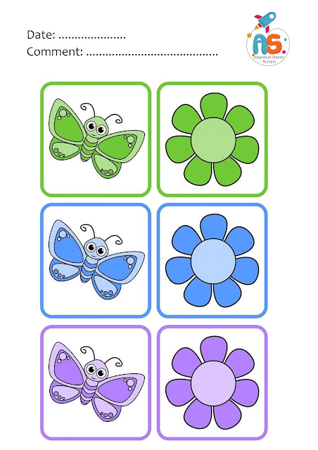 - ثم نطلب من الطفل توصيل الزهرة بالفراشة ذات نفس اللون ونركز فى هذا النشاط على فصل الألوان والتعرف على الفراشات الرقيقة .
